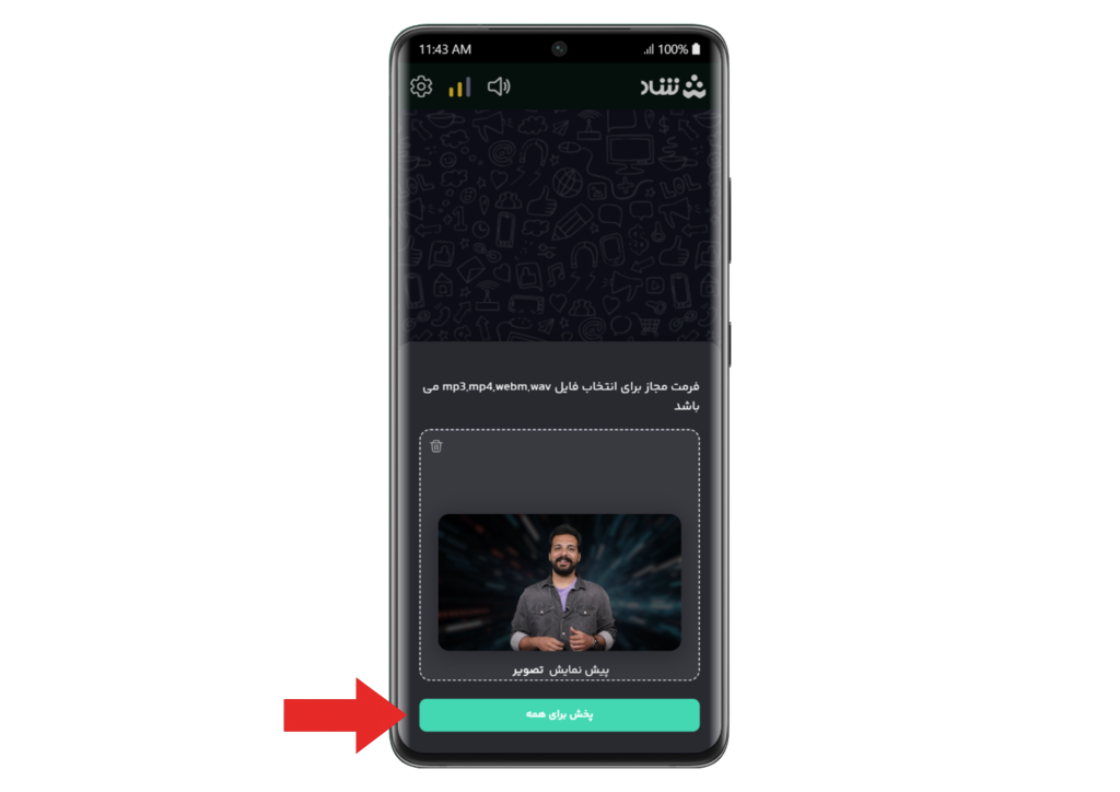 در مرحله بعدی فایل «صوتی و تصویری» مورد نظر خود را انتخاب نمایید و سپس گزینه «پخش برای همه» را انتخاب کنید تا برای همه کاربران حاضر در کلاس مجازی به صورت مستقیم پخش شود.